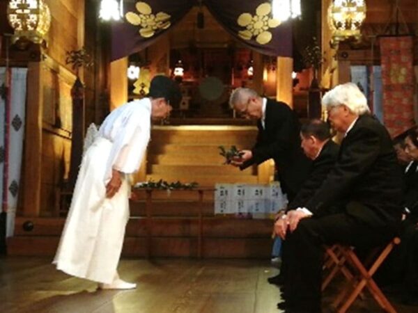 願成寺から力強い除夜の鐘が響く中、役員による玉串奉奠が行われ、西野町内会長からは新年のご挨拶をいただきました。式の後には参列者全員で町内の安全を祈願しました。