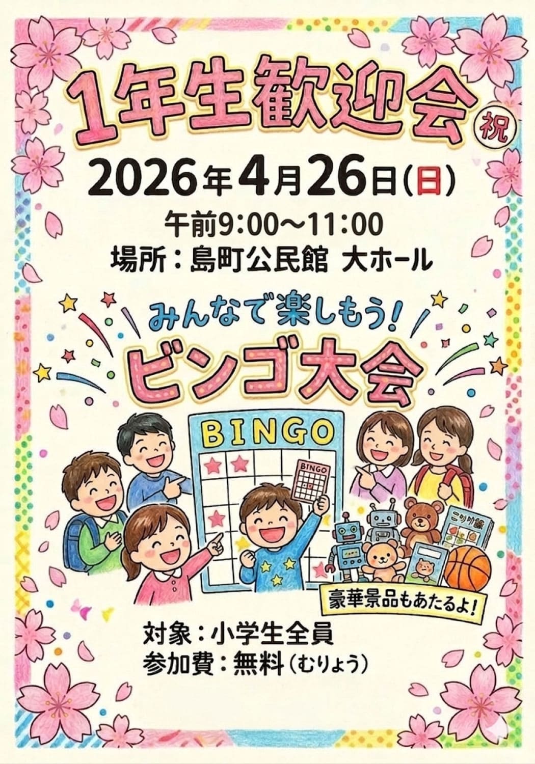 子ども会総会と新入生歓迎会 4月26日(日)9時から お知らせ 2026.04.01 児童部からのお知らせ 4月26日(日)9時から島町会館にて、令和8年度子ども会総会と新入生歓迎会を開催いたします。 新6年生が楽しいゲームやお土産を用意して、新1年生を歓迎します。小学1年生から6年生まで、みんなの参加を楽しみにしています。 新入生歓迎会の後には、同日行われるBBQ大会がありますので、ぜひ続けてご参加ください