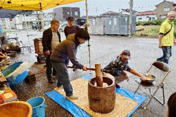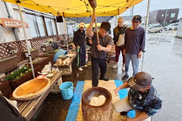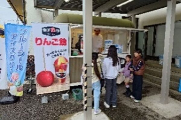 屋外では、餅つきや模擬店、ふるまい汁の他に、今年はりんご飴のキッチンカーが出店し好評でした。