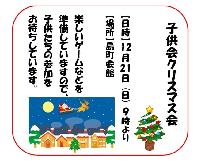 子供会クリスマス会 12月21日(日) 9時~ お知らせ 2025.12.01 児童部からのお知らせ 子供会クリスマス会 【日時】12月21日 (日) 9時より【場所】島町会館 楽しいゲームなどを準備していますので、子供たちの参加をお待ちしています。