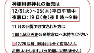 お知らせ 神棚用御神札の販売 神棚用御神札の販売は12/9(火)~25(木)平日午前中夜窓口:19日(金)夜8時~9時11月の回覧で注文された方は1組1,500円を公民館窓口へお持ちください㊟12/26以降、御神札は全て宮司さんにお戻しいたします。(公民館には残りません... 2025.12.01 お知らせ